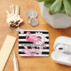 The product design features a flamingo with kaleidoscopic paisley patterns in shades of pink over black and white stripes background. This tropical bird design with personalised text makes a modern and unique keychain.