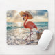 A fashionable flamingo strutting confidently along the ocean surf, donning a trendy sun hat and chic sunglasses