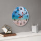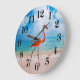 This round shape wall clock is shown with a photo print of a beautiful flamingo beachside.