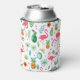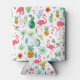 Cute pink flamingos with tropical fruits, flowers, leaves, and trees in a seamless pattern.