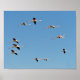Flamingos in flight (Phoenicopterus ruber) on the blue sky background, in the Camargue is a natural region located south of Arles, France, between the Mediterranean Sea and the two arms of the Rhône delta