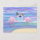 Illustration of two flamingos standing on a beach wearing knitted hats.