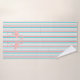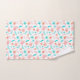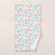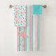 Here's a cute tropical theme towel set that uses soft teal and coral pink as the predominant colours. The bath towel has a pretty stripe pattern in light coral, dark coral, light teal, dark teal, and white. At the bottom of the towel is an adorable image of two pink flamingos. With their heads close together, they form a heart. The hand towel is white, with a repeating pattern in matching coral pink and teal, of flamingos and hibiscus flowers. The washcloth is matching teal, with white polkadots. This set is beautiful for any bathroom with a tropical theme.