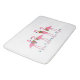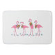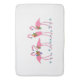 Pretty pink flamingo bath mat for the tropical themed bathroom. Matches the shower curtain with the same flamingo design. Four birds wear hibiscus and holly wreaths and stand among aqua blue starfish on a white background.