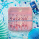 Pink flamingos stand gracefully along a beach reflected in the calm water as a full pink moon rises in the pastel sky