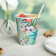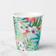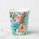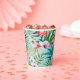 Brightly coloured Luau cups with a flamingo & palm print. Turquoise green, pink, and blue.