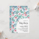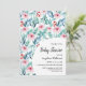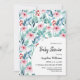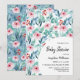 Flat lay baby shower invitation card featuring adorable watercolor plant images with soft pastel emerald and blue leaves, branches, and soft pink flowers.