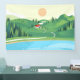 Illustration in flat style of house in the hill with lake and forest near beautiful landscape illustration