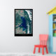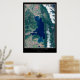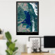 Flathead Lake, Montana is one of the largest freshwater lakes west of the Mississippi River, known for its crystal clear waters and stunning scenery. This satellite imagery poster captures the vivid blue hues of the lake and its surroundings, including the snow-capped peaks of the Rocky Mountains in the distance. The lake is a popular destination for fishing, boating, and swimming, and its shorelines are dotted with charming towns and rustic cabins.