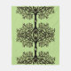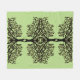 Graphic image of tree with weeping branches/leaves. Image has been replicated and turned to give a kaleidoscope effect. Image has slightly red cast to the black graphic. Background is light green in color.