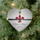 Your first Christmas together as a couple is special. Commemorate that first holiday season with this heart shaped white, red and silver design Fleur de Lis ornament featuring a red Fleur de Lis symbol with a heart as its centre. Personalise on the front with your names and the year. The back reads Our First Christmas. Keep the text or change it using the template.
