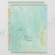 This elegant and sophisticated collection blends the best of tradition and the freshness of the contemporary. The “Fleur dis Lys Damask” wedding ensemble has been created from original artwork by Audrey Jeanne Roberts. It features several elegantly blended background patterns of hand painted lace, stripes and fleur de lis. A pair of gold hand painted wedding bands, backgrounds of aqua blue, blue, soft parchment tan and golden watercolored borders and elements all combine to create a gorgeous subtle and sophisticated invitation. On the reverse side is the same pattern without the frame, corner elements and rings. Your names and wedding date finish off the design. There is a full range of products available to carry the theme throughout your entire wedding. YOU MIGHT ALSO ENJOY: