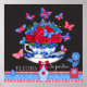A poster with an antique porcelain cup filled with blue and red flowers and butterflies against a blackboard background. Looks great as a pair with Fleur Porcelain Birds and Birdcage card. Pretty French Flair!