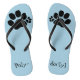 Polydactyl (multiple toes) paw print sandals. Left and right paw-print on corresponding toe. Background is light blue. At heels is the word "Poly-" "dactyl" - separated.