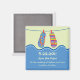 Fun and modern save the date magnet with a beach theme. Great for a spring or summer wedding. Ideal for a beach or outdoor wedding. Features flip flops with different patterns hanging from a clothing line and ocean waves at the bottom.