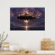 An immense floating island crowned by a grand, spired castle city gleams amid turbulent purple-orange clouds, with powerful golden light beams pouring downward to touch a serene ocean surface. Stars scatter across the night sky while a low sunset horizon warms the edges in peach and rose, creating layers of depth, mystery, and radiant energy. The composition evokes mythic grandeur, cosmic power, ancient legends reborn, sublime wonder, and the thrill of impossible realms—perfect for fantasy bedrooms, gaming rooms, meditation spaces, home offices, modern minimalist walls, or as awe-inspiring gifts for dreamers, fantasy enthusiasts, spiritual seekers, or anyone drawn to epic scale, surreal beauty, and transformative imagination.
