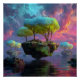 Three colossal, glowing trees with electric turquoise, lime, and chartreuse canopies dominate floating islands of mossy rock and ancient ruins. Tiny crystals and patchwork greenery sparkle beneath the branches while the islands hover above a mirror-like ocean reflecting a dramatic sky of swirling magenta, violet, pink, and cyan clouds pierced by radiant light beams. The scene radiates otherworldly abundance, magical vitality, cosmic wonder, nature’s impossible triumph, and the thrill of hidden realms—perfect for fantasy bedrooms, gaming setups, meditation spaces, creative studios, modern eclectic decor, or as mesmerizing gifts for dreamers, fantasy lovers, spiritual seekers, or anyone drawn to vibrant surrealism, luminous nature, and high-energy imagination.