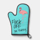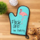 Funny pink flamingo oven mitt says Flock off! I'm baking! Perfect flamingo theme kitchen accessories for the person in your household or circle of friends who is known for their baked goods or fabulous casseroles.