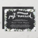 This elegant, modern 55th wedding anniversary invitation features lovely brush script calligraphy, beautiful blue and white flowers, typography that reads "Just Married (fifty-five years ago!)," and a rustic chalkboard background.