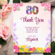 Show your gratitude in style with this elegant 80th birthday thank you card featuring vibrant floral accents and a heartfelt message. The front of the card displays a large "80" in colourful floral design and the words "Thank You" in a bold script, followed by a customisable message. The back side features a touching note of appreciation for celebrating a milestone of 80 wonderful years filled with love, laughter, and memories. This card is the perfect way to express your thanks for attending your special day and for any generous gifts received. Easily personalise this thank you card to reflect your own unique sentiments. Enjoy!