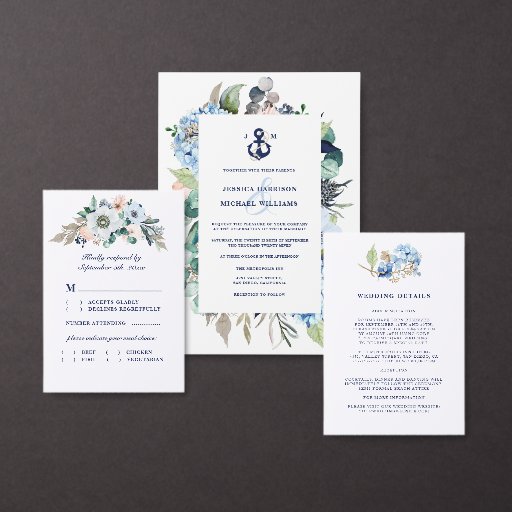 Joyful and creative beach wedding design combining nautical elements (navy anchor, knot, starfish) with beautiful floral garland of blue hydrangea, blush and white anemone flowers, eucalyptus leaves, dahlia, and greenery. To love, laughter and happily ever after. Bride’s and Groom’s monograms. Navy lettering. Truly unique. Ideal for beach wedding, nautical wedding, destination wedding, summer wedding.