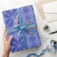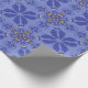 A blue wallpaper with a floral and geometric pattern in gold and darker blue, shown as partially unrolled and flat, conveying elegance and sophistication.