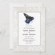 Gothic wedding invitation featuring a raven and a lace background with a gilded navy blue rose harlequin pattern reverse.