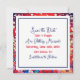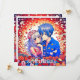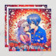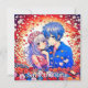 Personalised wedding invitations with an anime theme. Anime boy and girl cuddling surrounded by colourful hearts and flowers. Cute anime girl and boy with blue hair. Colours are red, blue, white and red mostly.