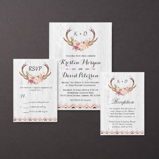 Boho Stylish Deer Antler Rustic Wood Invitations Suite.