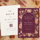 Elegant Wildflower arch burgundy, burnt orange, terracotta and beige fall wedding invitation with wedding website QR code for online RSVP. This enchanting boho chic floral wedding invitation is a stunning blend of autumnal warmth and elegant charm. Featuring hand-painted, watercolor wildflowers around an elegant arch design, the invitation showcases a rich colour palette of burgundy, burnt orange, burnt umber, coral, orange, brown, yellow, green, terracotta, coral, purple, and pink. The warm earthy autumnal tones create a perfect harmony, making it an ideal choice for a fall wedding. The elegant script and modern typography bring a touch of sophistication, while the whimsical wildflower watercolors around the arch window add a personal, bohemian flair to all your essential wedding details. Designed by the talented artist Catherine Sweetman, this unique invitation embodies the spirit of a cosy, intimate celebration in the heart of autumn. With easy-to-personalise templates, it offers a seamless way to convey your wedding information with style and artistry including a website QR code template for online RSVP for your guests. The background in a rich burgundy and beige adding a natural warmth, bringing the beautiful florals to life in a way that feels both fresh and timeless.
