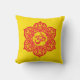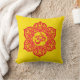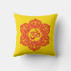 A deep red Aum symbol sits inside of a stylised lotus flower. The circular pattern is highlighted to create a light shine on the surface which sits on a bright yellow background. Six elegant leaves reach out from the centre of the design to create a beautiful symmetrical pattern. This unique pillow design is a striking representation of this spiritual symbol.