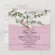 This design has a branch of tiny hydrangea blooms with greenery flowing across the top of the design. At the top it says It's A Girl and under the branches is a tiny egg setting in a nest with a Momma bird watching. The flowers and bird are in a soft pink. There is a banner beneath the floral design with room for the Mum's name and shower details. All the design is setting on a whitewashed barn wood look background.