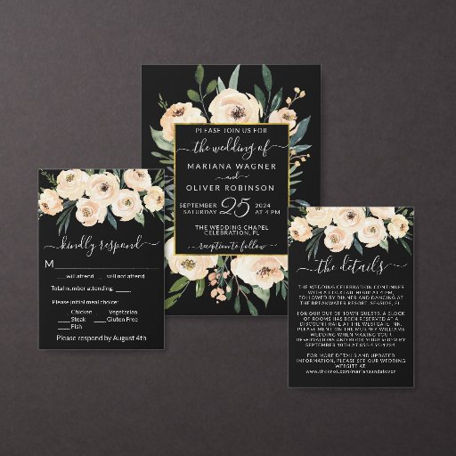 Black Floral Beige Blush Wedding Invitation SuiteDesigned by Denise Witmer