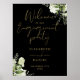 This elegant black and gold botanical greenery floral engagement party welcome sign can be personalised with your information in chic typography. Designed by Thisisnotme©