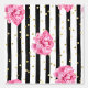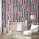 This feminine girly wallpaper features pink watercolor flowers with vertical black stripes and gold confetti pattern. The perfect accent to your home decor.