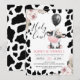 Cute black and white cow themed first birthday invitation for a baby girl featuring a cartoon like cow, black a balloon, a cow print pattern and pink floral arrangements. This girls holly cow first birthday invitation is a cute way to invite guests to a cow themed first birthday party.