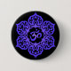 An Aum or Om design sits inside of a stylized lotus flower. The circular pattern is colored with a deep blue that is highlighted to create a light shine on the surface. The background is painted pure black that can be seen through the negative space of the flower. This stylish button is a striking representation of this spiritual symbol.
