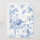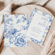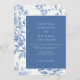 This refined blue and white invitation showcases an elegant toile-inspired floral border and a crisp, minimalist centre for your wedding details. Beautifully balanced typography pairs graceful script with classic serif lettering for a timeless, romantic feel. Fully customisable with your names, wedding date, and location, this design is perfect for announcing your celebration with style. An ideal choice for traditional, garden, or coastal weddings, setting the perfect first impression for your special day.