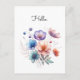 A watercolor illustration of pretty flowers in teal, peach, pink, purple, blue. This botanical print is perfect for a simple Hello greeting, but you can change the text to your preferred greeting. AI assisted graphic purchased with commercial use. Artwork: DreamCafeArt