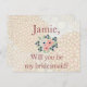 Ask your friends to be your bridesmaid using this beautiful post card. "Floral Bridesmaid invitation" features a lovely floral chic background with beige coloured flowers. The text is written in burgundy. Name is written in print, with a green, blue and peach flower bouquet underneath. "Will you be my bridesmaid is written at the very bottom. Stop by and shop today!