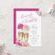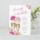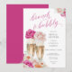 Bright pink bridal shower invitation with custom 'brunch and bubbly' script features two sparkly champagne flutes and pink watercolor flowers on top of them. Choose from our colour options and check out the other matching products.