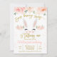Cute bunny face first birthday invitation for a little girl featuring a some sweet bunny is turning one faux gold heading. The design also includes a lovely pink floral arrangements and dots. This first birthday invitation will set the scene for a pink and gold some bunny themed first birthday party for a baby girl.