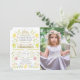 This cute girl's first holy communion photo invitation features a white background with a jumping bunny, chick, spring florals/flowers, roses, foliage, and butterflies. The reverse side features a light pink background with white polka dot patterns. Perfect for celebrations in spring! Change the background colour on the back and personalise it for your needs. You can find matching products at my store.