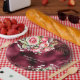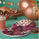Elegant wedding paper plates featuring roses and a burgundy foil and gold glitter background.