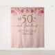 Girly glitter, millennial pink background, with fancy script name typography. Happy 50 and fabulous birthday party backdrop. Pink Roses and butterfly top border. Great for 50th celebrations.