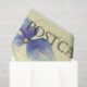 Blue, antique floral, green butterfly, and yellowed hydrangea with Australian post stamps and old handwriting on old yellow background.