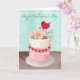 Blank inside Valentine’s greeting card featuring a hand drawn illustration of a pink cake with flowers and hearts on a teal and brown.