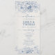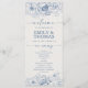 Floral Chinoiserie Wedding Program is an elegant wedding program card designed with Chinoiserie patterns and sophisticated floral details. This card provides guests with information about the ceremony and events, helping them easily follow along throughout the wedding day. With its classic and refined style, this wedding program can be customised to match the theme and colours of your wedding, creating a cohesive and elegant look for your wedding stationery.