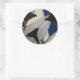 The image on the classic, round, glossy sticker consists of a side view of pink-purple Morning Glory wildflowers on the vine with shadows on the wooden fence. In the background is a house and blue sky.