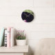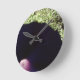 Image on round, medium-sized, wall clock is the close-up of a partial deep pink-purple Morning Glory wildflower. The image showcases the vibrancy of the delicate, little flower.